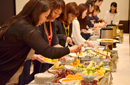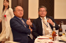 今回は皆様からのご要望が多かった料理に関してゆっくりと楽しんで頂けるように、ビュッフェ形式では無く各テーブル毎の提供をさせて頂きました。また、2017年度に外部団体から表彰された学生並びに教員をご紹介するパネルを展示。その中から教員の依田先生・日高先生・堀先生への花束贈呈で讃えました。私達の母校の学生や教員の皆様が活躍していると言う事を同窓生に知って頂く良い機会となれば幸いです。イベントもひょっとこ踊りや景品抽選会だけで無く、数々のコンクールに入賞している学術文化会 吹奏楽部の皆様にも参加頂き、彼らの演奏で懇親会を大いに盛り上げて頂きました。さらに、恒例の近大節演舞の際には、前実行委員長であった武内氏が応援団関係者より預かった応援団大団旗を披露。大団旗をバックに近大節が行われると、当時を知る同窓生や教職員、初めて見る若い世代の方からも感嘆の声が発せられていました。